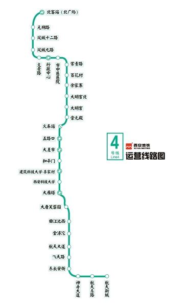 線路依次貫穿西安航天基地、曲江新區(qū)、雁塔區(qū)、碑林區(qū)、未央?yún)^(qū)、經(jīng)濟(jì)技術(shù)開發(fā)區(qū),途經(jīng)西安北站、大明宮國(guó)家遺址公園、火車站、五路口、大雁塔、大唐芙蓉園、曲江池遺址公園等人流密集區(qū),全線設(shè)車站29座,均為地下站,設(shè)航天城車輛段1座,草灘停車場(chǎng)1座。開通初期因西安火車站改造,故該站甩站運(yùn)行,各次列車不停站通過。按照現(xiàn)行票價(jià)政策,四號(hào)線全程票價(jià)為8元。