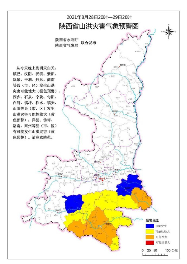 陜西省水利廳與陜西省氣象局聯(lián)合發(fā)布山洪災(zāi)害氣象預(yù)警:預(yù)計2021年8月28日20時至2021年8月29日20時,鎮(zhèn)巴、漢陰、漢濱、紫陽、嵐皋、平利、丹鳳、商南等縣(市、區(qū))發(fā)生山洪災(zāi)害可能性大(橙色預(yù)警),西鄉(xiāng)、石泉、寧陜、旬陽、白河、鎮(zhèn)坪、柞水、鎮(zhèn)安、山陽等縣(市、區(qū))發(fā)生山洪災(zāi)害可能性大(黃色預(yù)警),洋縣、佛坪、洛南、商州等縣(市、區(qū))有可能發(fā)生山洪災(zāi)害(藍色預(yù)警)。請注意防范。