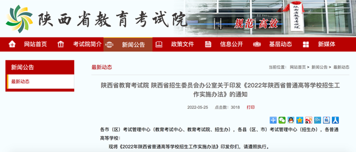 5月25日,陜西省教育考試院、陜西省招生委員會辦公室印發(fā)了《2022年陜西省普通高等學(xué)校招生工作實施辦法》,明確了陜西2022年高考考試、評卷、志愿填報招生錄取等政策。