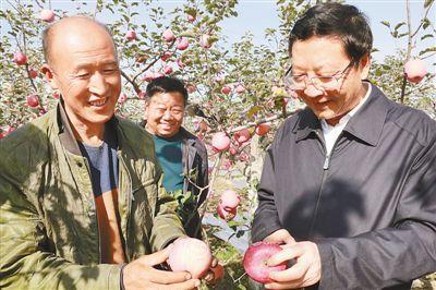 薛占海(右)在寶塔區(qū)棗園街道辦廟溝村幫果農(nóng)朱懷明算蘋果銷售賬。 本報(bào)記者 龔仕建攝 一見到陜西金風(fēng)科技有限公司負(fù)責(zé)人李超,延安市長薛占海就急切地問:“你……