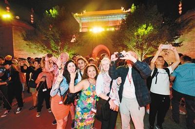 昨日,外國游客在南門里合影留念。記者 竇翊明 攝 中華多雄壯,大美在西安。隨著“中歐旅游年”系列活動的展開,9月12日晚,由陜西省旅游發(fā)展委員會主辦的“英……
