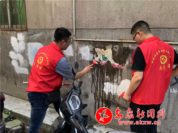 活動中,志愿者分為四組在轄區(qū)主街道及背街小巷清理野廣告和衛(wèi)生死角、整治車輛亂停亂放和占道經(jīng)營、夯實(shí)“門前四包”。