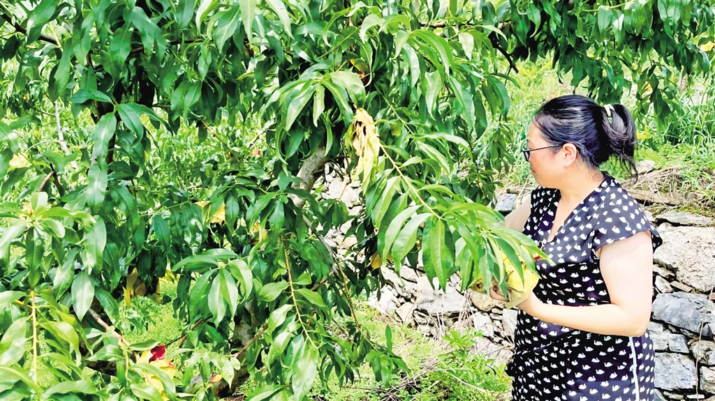 穿過村莊,山坡上500畝桃園綠意盎然;刎(fù)責(zé)人伍娟與工人正采摘套袋。“2017年建設(shè)的桃園,今年雖受旱情影響,產(chǎn)量仍達(dá)30萬斤,產(chǎn)值約300萬元。”