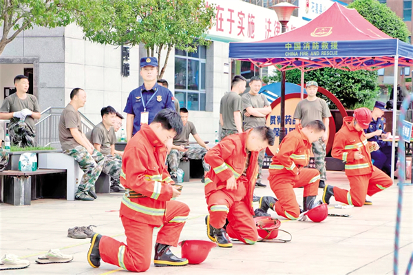 “開始!”裁判一聲令下,參賽隊員們?nèi)珉x弦之箭,迅速在原地依次穿戴全套防護(hù)裝備。