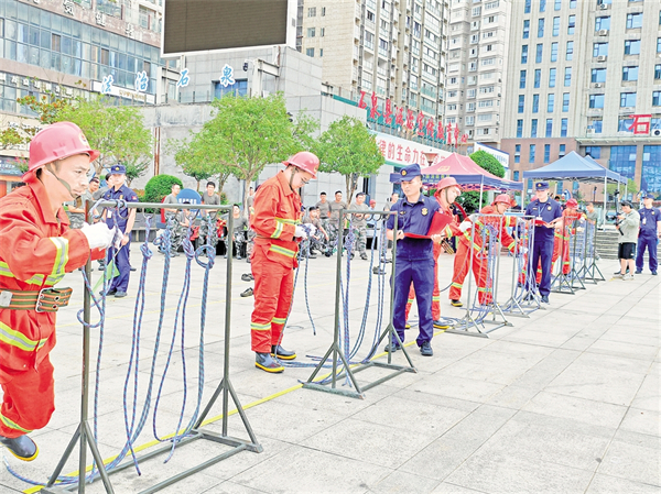 著裝完畢,隊員迅速移步至繩架前。卷結(jié)、雙股單結(jié)、雙股8字結(jié)、蝴蝶結(jié)、單椅子扣,5個基礎(chǔ)繩結(jié)在指尖翻飛中快速成型。在救援現(xiàn)場,一根繩索、一個繩結(jié),往往是連接生命的紐帶,是救援人員自身防護(hù)的“生命線”,也是保障被困人員轉(zhuǎn)移安全的核心前提。