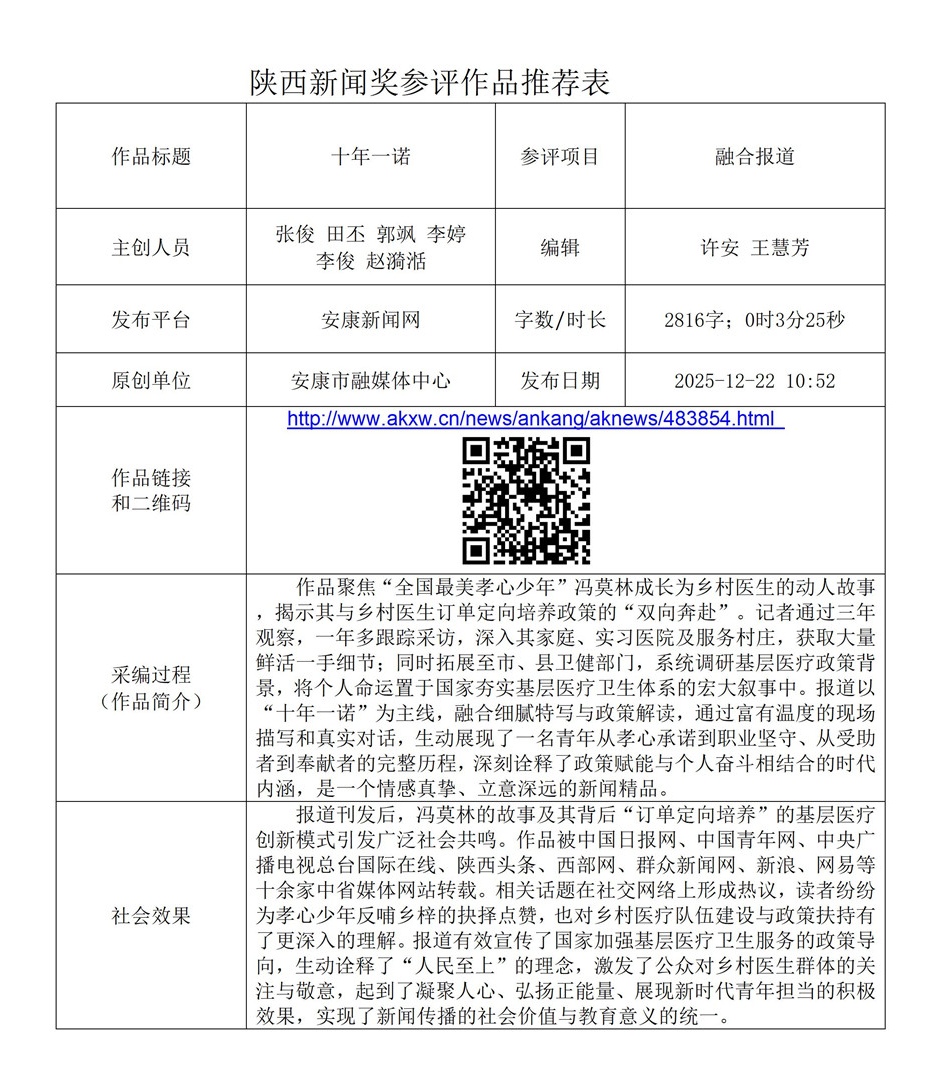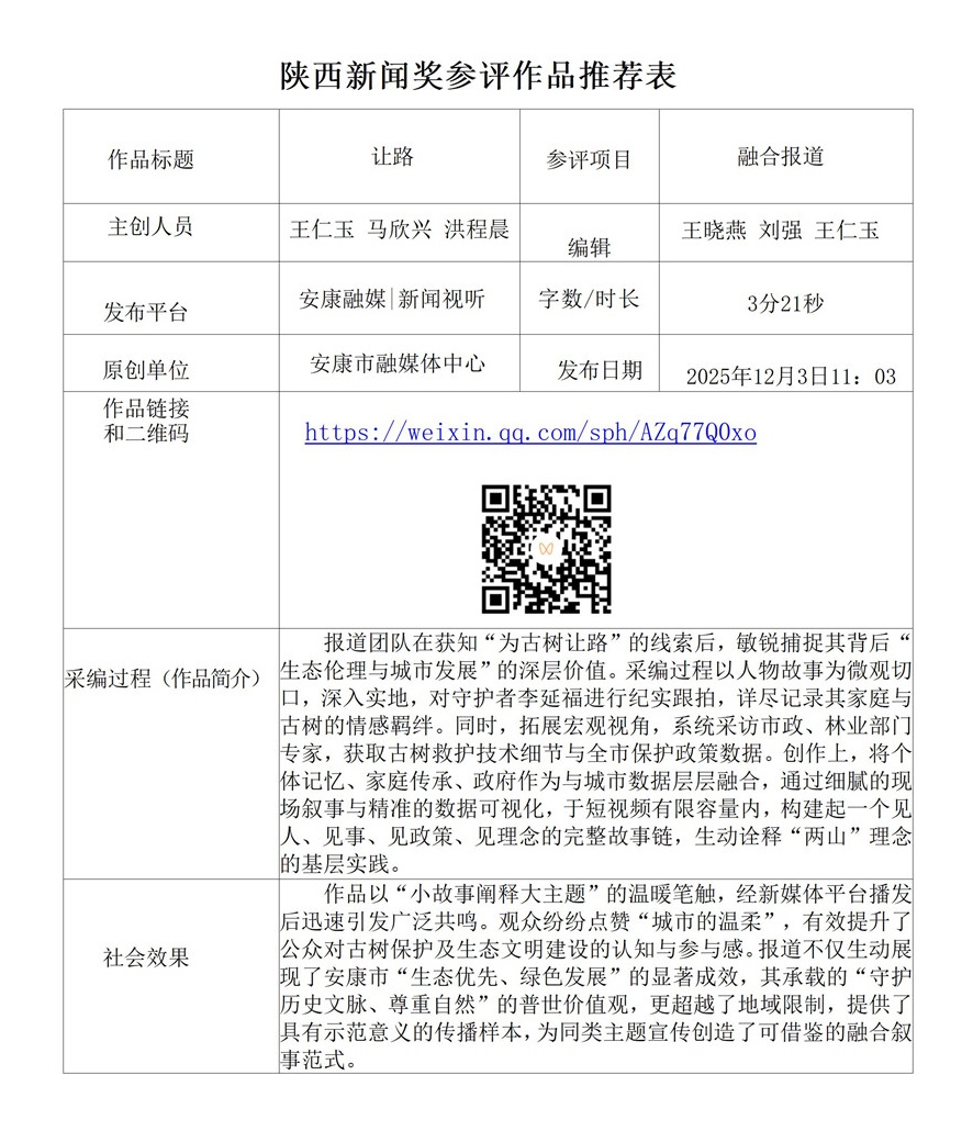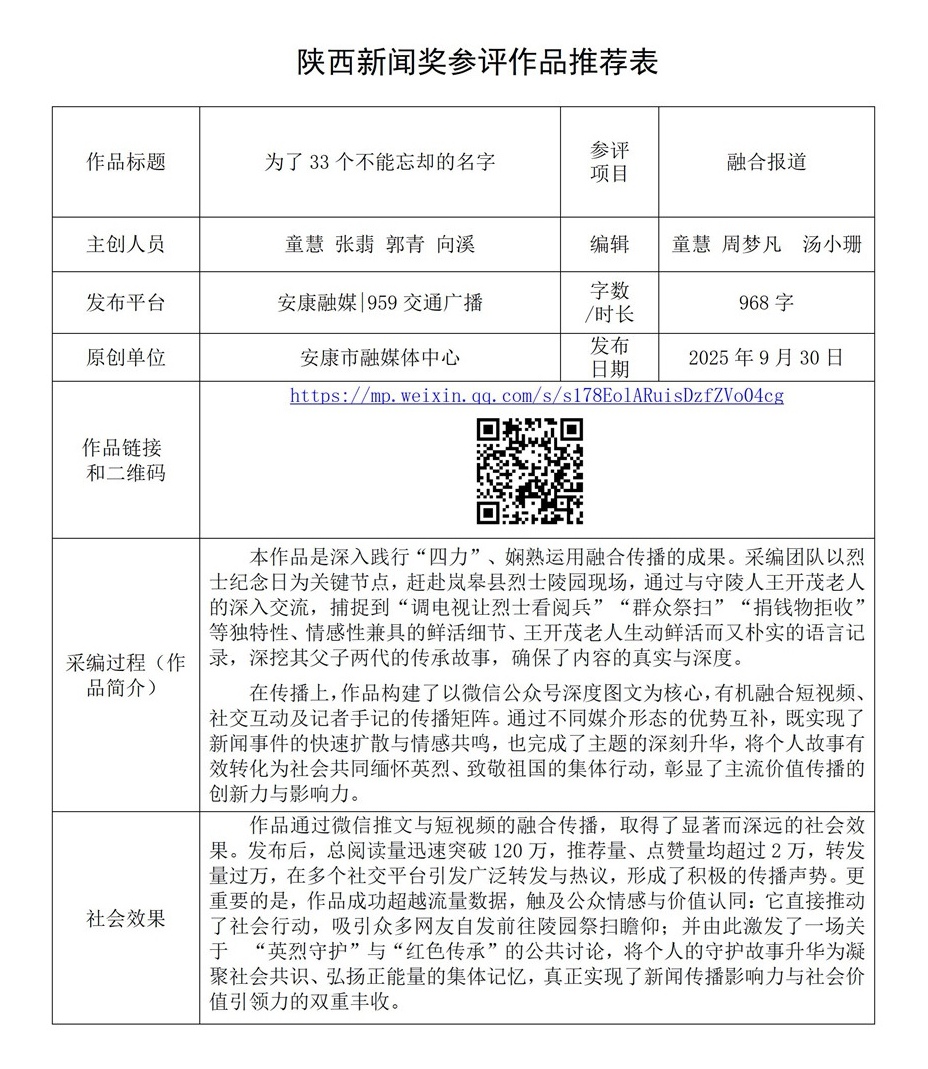 根據(jù)《陜西新聞獎、陜西省優(yōu)秀新聞工作者評選辦法》和《關(guān)于開展2025年度陜西新聞獎融合報道、應(yīng)用創(chuàng)新和新媒體新聞專欄作品推優(yōu)工作的通知》要求,經(jīng)個人申報、部門推薦和中心編委會嚴(yán)格篩選,對以下3件2025年度陜西新聞獎融合報道、應(yīng)用創(chuàng)新、新媒體新聞專欄參評作品進行公示。(作品推薦表附后)